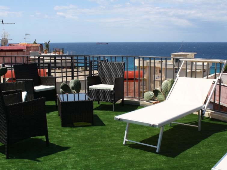 3-room apartment ”Attico”, for 4 people, 70 m2, on the upper floor, comfortable furnishings. Living/dining room with cable TV and dining-table. Smoking allowed. Internet (DSL/LAN). 1 sofa bed and 1 double sofa bed. Sleeping room with 1 single bed and 1 double bed. Kitchen with 4 hot plates, micro wave, oven, dining table, fridge and deep freezer. Bath/shower/WC. Terrace 150 m2, terrace furniture. Other equipment: hair dryer, iron, washing machine, solarium…. Lue lisää »