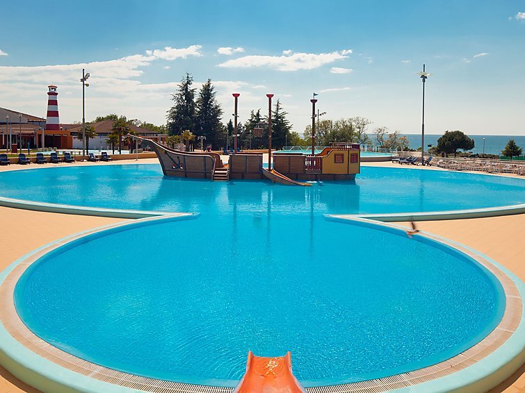 4-huoneen asuntovaunu, 32 m2. Olo/ruokailuhuone, satelliitti TV ja ilmastointi. Uloskäynti terassille. 1 huone, 1 kapea parisänky (140 cm, pituus 200 cm). 2 huonetta, kaikissa huoneissa 2 vuodetta (70 cm, pituus 190 cm). Avoin keittiö (4 keittolevyä, mikroaaltouuni, pakastin, kahvinkeitin). Suihku/WC. Terassi 10 m2, katettu. Terassikalusteita, lepotuoleja (2). Käytettävissä: hyttysverkko, syöttötuoli, lastensänky (lisämaksu). Internet (  Langaton LAN [WLAN]    , lisämaksu). Huomioitavaa: savuton talo. Asuntovaunut sijaitsevat 350 m päässä rannasta ja mereltä…. Lue lisää »