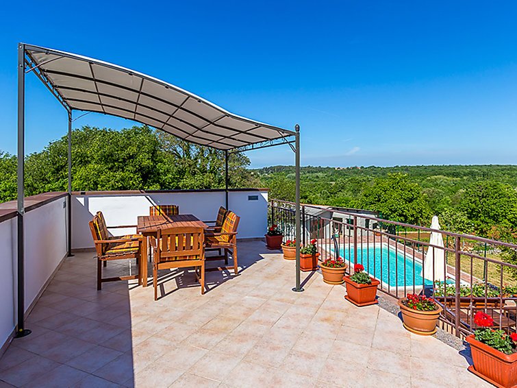 8-huoneen talo, 205 m2, 3 tasossa. Käytännöllisesti ja viihtyisästi sisustettu: olo/ruokailuhuone, satelliitti TV (litteänäyttö). 1 huone, 1 kapea parisänky (160 cm, pituus 200 cm). Avoin keittiö (4 keittolevyä, uuni). Uloskäynti uima-altaalle. Kylpy/WC. Yläkerrassa: (ulkoportaat) olo/ruokailuhuone, satelliitti TV (litteänäyttö), ilmastointi. Uloskäynti terassille. 2 huonetta, kaikissa huoneissa, 1 kapea parisänky (160 cm, pituus 200 cm). Avoin keittiö (4 keittolevyä, uuni, astianpesukone, pakastin, kahvinkeitin). Suihku/WC. Kattokerroksessa: olo/ruokailuhuone, satelliitti TV ja ilmastointi. Uloskäynti terassille. 1 huone, 2 vuodetta (90 cm, pituus 200 cm). 1 huone, jossa viisto katto, kattokorkeus 200 – 350 cm, 1 kapea parisänky (160 cm, pituus 200 cm). Avoin keittiö (4 keittolevyä). Kylpy/WC. Terassi 10 m2 osittain katettu, terassi 6 m2. Terassikalusteita, lepotuoleja. Näkymä uima-altaalle. Käytettävissä: Internet ( Langaton LAN [WLAN] , ilmainen). 2 lemmikkiä/koiraa sallittu…. Lue lisää »