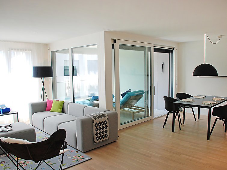 ”LaVille A-3-3”, 3-huoneen huoneisto, 89 m2, 3. kerroksessa, suunta lounaaseen. Avara ja vaalea, uudenaikaisesti ja hyvällä maulla sisustettu: avoin iso olo/ruokailuhuone, satelliitti TV, litteänäyttö, radio ja stereosoitin. 1 kahden hengen huone, 1 parisänky (2 x 90 cm, pituus 200 cm). 1 huone, 2 vuodetta (90 cm, pituus 200 cm). Avoin keittiö (uuni, astianpesukone, 4 induktioliesi, pakastin, kahvinkeitin, Kapselit kahvinkeittimeen (Nespresso) lisämaksusta), ruokapöytä. Uloskäynti parvekkeelle. Kylpy/WC, suihku/WC. Lattialämmitys. Parveke 9 m2, etelään ja länteen. Parvekekalusteita, lepotuoleja (2). Näkymä vuorille ja maaseudulle. Käytettävissä: pesukone, kuivausrumpu, silitysrauta, syöttötuoli, lastensänky alle 2 vuotiaalle (lisämaksu), hiustenkuivaaja. Internet (  Langaton LAN [WLAN]    , ilmainen). Autotalli n:o 50. Huomioitavaa: savuton huoneisto…. Lue lisää »