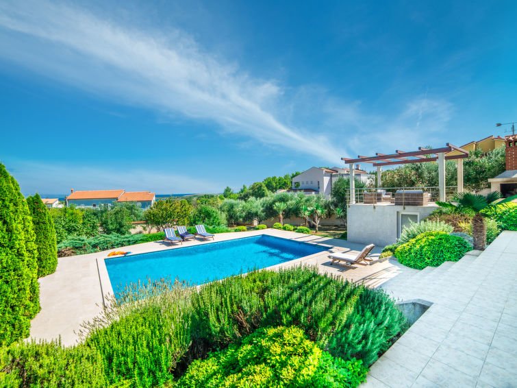 6-huoneen huvila, 250 m2, 2 tasossa. Hyvällä maulla sisustettu: olo/ruokailuhuone, satelliitti TV (litteänäyttö), ilmastointi. Uloskäynti uima-altaalle. Avoin keittiö (4 keittolevyä, uuni, astianpesukone, mikroaaltouuni, pakastin, kahvinkeitin). Suihku/WC. Yläkerrassa: 3 huonetta, kaikissa huoneissa, 1 kapea parisänky (180 cm, pituus 200 cm), ilmastointi. Uloskäynti terassille. 1 huone, 2 vuodetta (100 cm, pituus 200 cm), ilmastointi. 1 huone, 1 vuode (100 cm, pituus 200 cm), ilmastointi. Uloskäynti terassille. 2 suihkua/WC:tä. Terassi 65 m2. Terassikalusteita, lepotuoleja. Näkymä merelle ja uima-altaalle. Käytettävissä: tallelokero, lastensänky, hiustenkuivaaja. Internet ( Langaton LAN [WLAN] , ilmainen). Enintään 1 lemmikki/koira sallittu…. Lue lisää »