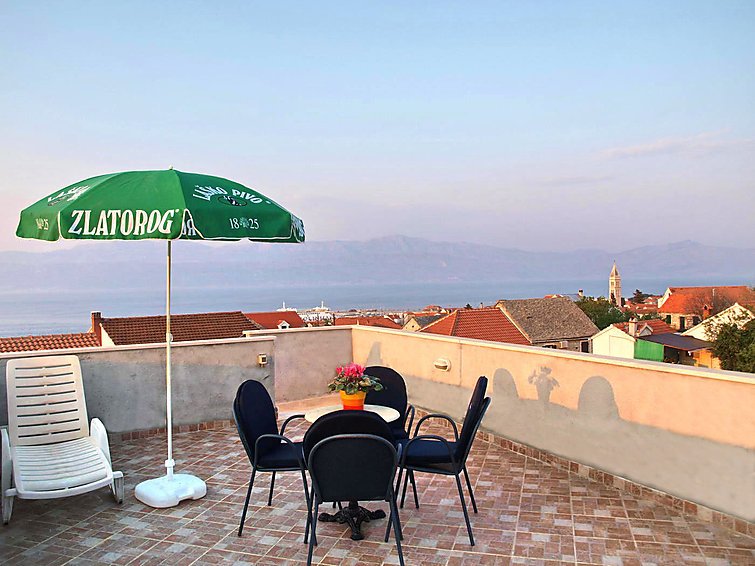 3-huoneen huoneisto, 70 m2, 1. kerroksessa, kauniisti sisustettu: sisääntulo, 16 m2. Olo/ruokailuhuone, jossa viisto katto, kattokorkeus 170 – 300 cm, satelliitti TV, DVD ja ilmastointi. Uloskäynti terassille. 1 huone, kattokorkeus 170 – 300 cm, 2 vuodetta (90 cm, pituus 200 cm). 1 huone, kattokorkeus 170 – 300 cm, 1 kapea parisänky (160 cm, pituus 190 cm). Uloskäynti parvekkeelle. Avoin keittiö (4 keittolevyä, uuni, astianpesukone). Suihku/bidet/WC. Pieni parveke 2 m2, iso terassi 25 m2. Terassikalusteita, lepotuoleja. Erittäin kaunis näkymä merelle ja paikkakunnalle. Kattoterassille pääsee ulkoportaita pitkin olohuoneesta…. Lue lisää »