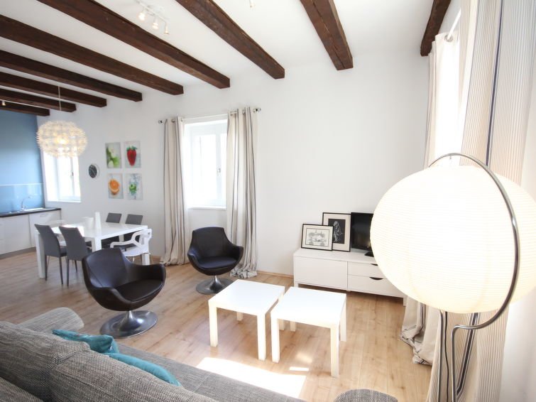 3-huoneen huoneisto, 70 m2, 1. kerroksessa, suunta etelään. Olo/ruokailuhuone, 20 m2, 1 vuodesohva kahdelle (130 cm, pituus 200 cm), satelliitti TV (litteänäyttö), ilmastointi. Uloskäynti terassille. 1 huone, 1 kapea parisänky (160 cm, pituus 200 cm). 1 huone, 2 vuodetta (90 cm, pituus 200 cm). Avoin keittiö (astianpesukone, 2 keraaminen keittotaso, mikroaaltouuni, kahvinkeitin). Suihku/WC. Terassi 12 m2. Terassikalusteita. Käytettävissä: pesukone. Internet ( Langaton LAN [WLAN] , ilmainen)…. Lue lisää »