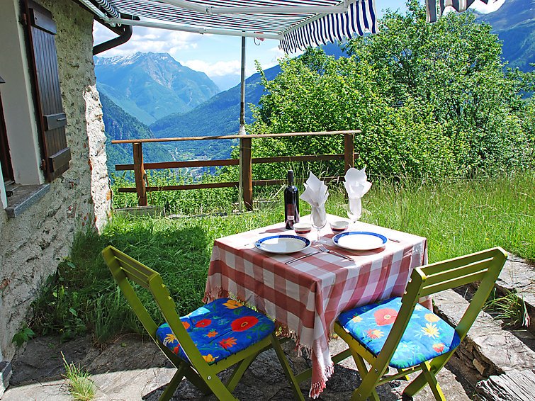 ”Rustico Piancabella”, 2-huoneen talo 2 tasossa, suunta etelään. Osittain viistot katot, yksinkertaisesti ja mukavasti sisustettu: avoin pieni olo/ruokailuhuone, 1 vuodesohva (120 cm, pituus 180 cm), ruokapöytä, TV, radio, stereosoitin ja puu-uuni. Uloskäynti puutarhaan, puutarhaistumapaikalle. Avoin keittiö (3 keittolevyä), ruokailunurkkaus. Suihku/WC. Yläkerrassa: (jyrkät portaat) 1 avoin huone, jossa viisto katto, kattokorkeus 120 – 155 cm, 2 vuodetta (90 cm, pituus 200 cm), 1 parisänky (160 cm, pituus 200 cm). Luonnonkivilattiat. Terassi osittain katettu, etelään. Terassikalusteita, puutarhagrilli (liikuteltava), lepotuoleja (3). Ihastuttava panoraamanäkymä vuorille, laaksoon ja maaseudulle. Käytettävissä: syöttötuoli, lastensänky alle 2 vuotiaalle (lisämaksu). Huomioitavaa: soveltuu perheille. Savuton talo. Enintään 2 lemmikkiä/koiraa sallittu. TV vain CH. Palosammutin…. Lue lisää »