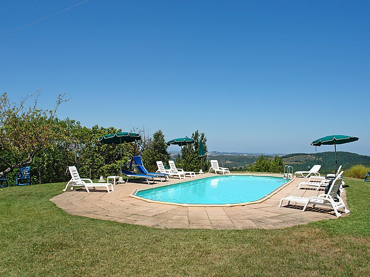 8-huoneen talo, 300 m2, 2 tasossa, sisääntulokerroksessa. Maalaistyylisesti sisustettu: sisääntulo. Avoin iso olo/ruokailuhuone, satelliitti TV, video ja CD. Uloskäynti puutarhaan, loggialle. Avoin olohuone, avotakka. 1 iso kahden hengen huone. Keittiö (6 keittolevyä, uuni, astianpesukone, mikroaaltouuni). Uloskäynti puutarhaan, loggialle. Suihku/WC, suihku/bidet/WC. Yläkerrassa: 2 kahden hengen huonetta. 1 huone, 1 kapea parisänky. 1 huone, 3 vuodetta. 1 huone, 1 vuode ja 1 parisänky. Parvi. Uloskäynti terassille. Kylpy/bidet/WC. Ihastuttava panoraamanäkymä maaseudulle. Käytettävissä: syöttötuoli. Internet ( Langaton LAN [WLAN] , lisämaksu). Aurinkoterassi (noin 50 m2). Yksi pohjakerroksen kylpyhuoneista on pieni…. Lue lisää »