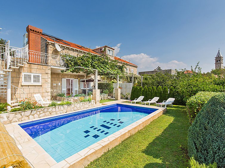 6-huoneen huoneisto, 150 m2, 2 tasossa. Kauniisti ja viihtyisästi sisustettu: olohuone, satelliitti TV. Uloskäynti puutarhaan, terassille, uima-altaalle. Ruokailuhuone. Keittiö (uuni, astianpesukone, 4 keraaminen keittotaso, pakastin, kahvinkeitin). Suihku, erillinen WC. Yläkerrassa: 1 huone, 2 vuodetta. Uloskäynti parvekkeelle, terassille. 1 kahden hengen huone. Uloskäynti parvekkeelle, terassille. 1 huone, 1 kapea parisänky. 1 huone, 2 vuodetta. Kylpy/bidet/WC, erillinen WC. Terassikalusteita. Vähäinen näkymä merelle. Käytettävissä: pesukone. Internet (  Langaton LAN [WLAN]    , ilmainen)…. Lue lisää »