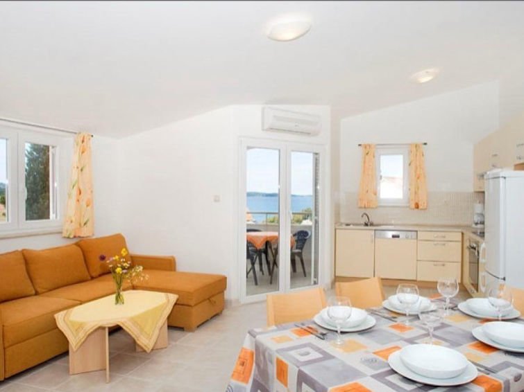 3-huoneen huoneisto, 80 m2, 1. kerroksessa, suunta lounaaseen. Olo/ruokailuhuone, 30 m2, 1 vuodesohva kahdelle (140 cm, pituus 200 cm), satelliitti TV (litteänäyttö), ilmastointi. Uloskäynti terassille. 1 huone, 1 parisänky (2 x 90 cm, pituus 200 cm). 1 huone, 1 x 2 kerrossänky (90 cm, pituus 190 cm). Avoin keittiö (uuni, astianpesukone, 4 keraaminen keittotaso, mikroaaltouuni, pakastin, kahvinkeitin). Suihku/WC, erillinen WC. Terassi 6 m2, katettu. Terassikalusteita. Vähäinen näkymä merelle. Käytettävissä: pesukone. Internet (  Langaton LAN [WLAN]    , lisämaksu)…. Lue lisää »