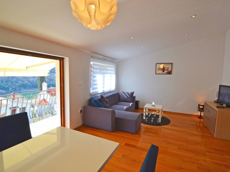 3-huoneen huoneisto, 60 m2, 2. kerroksessa, suunta lounaaseen. Olo/ruokailuhuone, 24 m2, 1 vuodesohva (130 cm, pituus 190 cm), TV (litteänäyttö), DVD ja ilmastointi. Uloskäynti terassille. 1 huone, 1 kapea parisänky (160 cm, pituus 200 cm). 1 huone, 2 vuodetta (90 cm, pituus 200 cm). Avoin keittiö (uuni, 4 keraaminen keittotaso, mikroaaltouuni, pakastin, kahvinkeitin). Suihku/WC. Terassi 8 m2. Terassikalusteita. Vähäinen näkymä merelle. Käytettävissä: Internet ( Langaton LAN [WLAN] , ilmainen). Huomioitavaa: oma sisäänkäynti…. Lue lisää »