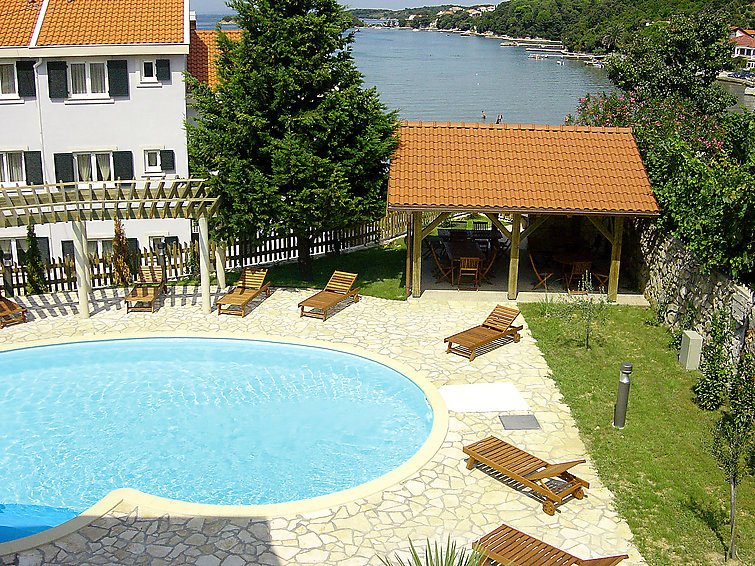 ”Tomislav 3”, 2-huoneen huoneisto, 48 m2, 1. kerroksessa, uudenaikaisesti ja viihtyisästi sisustettu: olo/ruokailuhuone, 30 m2, 1 vuodesohva kahdelle, satelliitti TV ja ilmastointi. Uloskäynti terassille. 1 huone, 1 parisänky (160 cm, pituus 200 cm). Uloskäynti terassille. Avoin keittiö (4 keittolevyä, mikroaaltouuni, pakastin). Suihku/WC. Terassi 12 m2, katettu. Terassikalusteita. Näkymä uima-altaalle. Käytettävissä: tallelokero. Internet ( Langaton LAN [WLAN] , lisämaksu). Pysäköintipaikka. Osittainen merinäkymä…. Lue lisää »