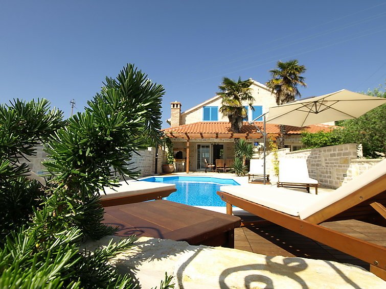 4-huoneen talo, 117 m2, 2 tasossa. Kauniisti sisustettu: olo/ruokailuhuone, satelliitti TV (litteänäyttö), ilmastointi. Uloskäynti terassille. 1 huone, 1 kapea parisänky (180 cm, pituus 190 cm). Avoin keittiö (4 keittolevyä, uuni, astianpesukone, pakastin, kahvinkeitin). Kylpy/bidet/WC. Lattialämmitys. Yläkerrassa: 2 huonetta, jossa viisto katto, kaikissa huoneissa, 1 kapea parisänky (160 cm, pituus 200 cm), suihku/WC ja ilmastointi. Lämmitys (lisämaksu). Terassi 30 m2, katettu. Terassikalusteita, lepotuoleja. Näkymä merelle ja uima-altaalle. Käytettävissä: Internet ( Langaton LAN [WLAN] , ilmainen). Pysäköintipaikka (aidattu)…. Lue lisää »